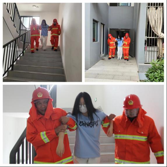 宿舍區(qū)第一聲“地震火災(zāi)突發(fā)情況警報(bào)”響起,參演學(xué)生迅速找到室內(nèi)安全三角區(qū)及承重柱(墻體突出部分),采取抱頭、閉眼,下蹲姿勢(shì),靠在承重墻邊,并盡量蜷曲身體,降低身體重心;5-10秒后,第二聲“應(yīng)急疏散信號(hào)”響起,參演學(xué)生用濕毛巾或衣服遮住口鼻,同時(shí)彎腰按疏散線路有秩序地進(jìn)行撤離,行至指定集合點(diǎn)集中。