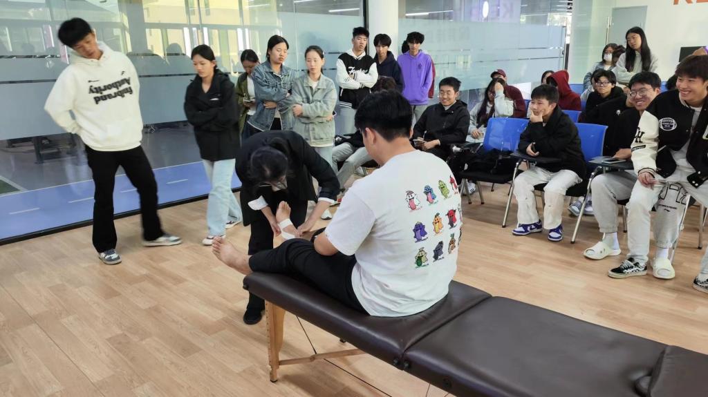 本次演練分為運(yùn)動(dòng)損傷處理演練和應(yīng)急逃生演練(消防、地震)兩個(gè)部分。運(yùn)動(dòng)損傷處理處理演練由健康學(xué)院溫曉黛老師、魏涵銳老師現(xiàn)場講授運(yùn)動(dòng)損傷的應(yīng)急處理流程,并現(xiàn)場進(jìn)行模擬處置。