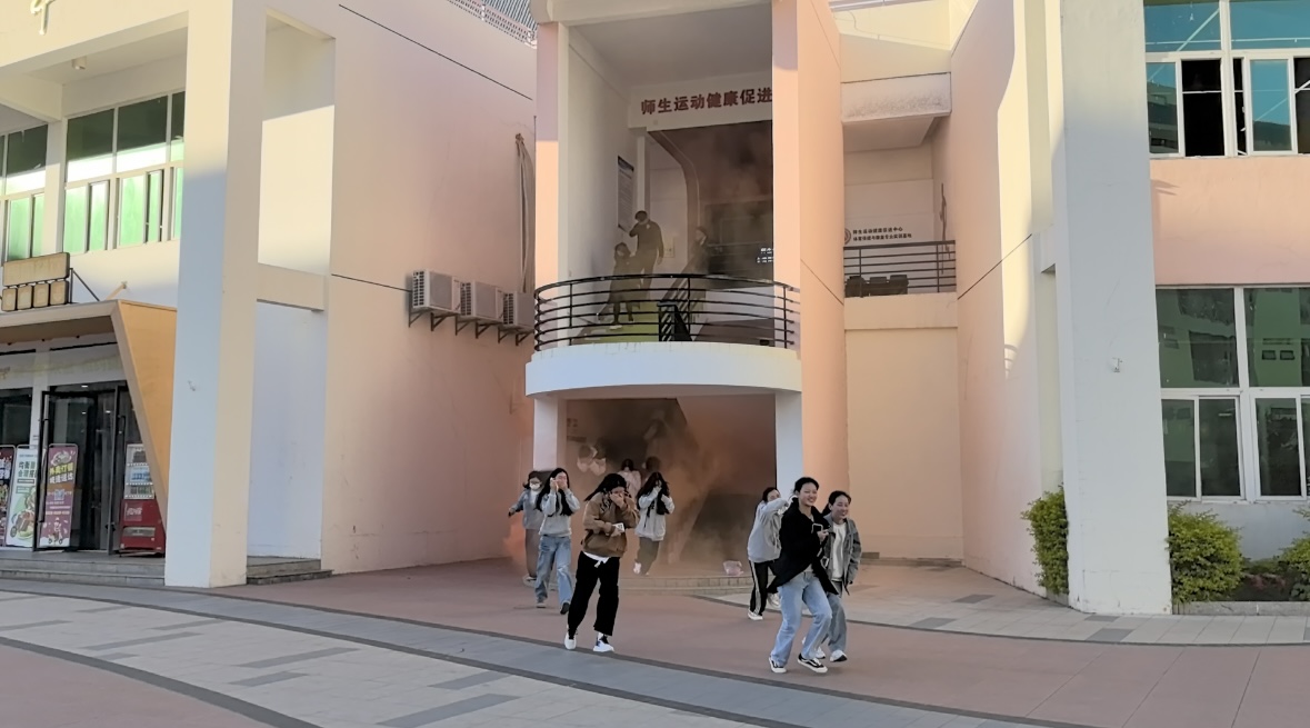 應(yīng)急逃生演練(消防、地震)前,由安全工作處黃興宇副處長講授介紹滅火器使用注意事項(xiàng)和應(yīng)急逃生演練疏散路線,提醒廣大師生聽從指揮、有序撤離,防止出現(xiàn)推搡、踩踏事故;各位置工作人員提前到崗,認(rèn)真履責(zé),確保撤離安全有序。演練開始,演練工作組接到演練指令后,模擬燃放煙霧,工作人員迅速組織學(xué)生依次從二樓師生運(yùn)動(dòng)健康促進(jìn)中心撤出,按照指定路線,分別有序從樓梯通道內(nèi)側(cè)撤離,做到彎腰、捂口鼻、迅速有序,到仁心食堂門口的空地集合并清點(diǎn)人數(shù)。