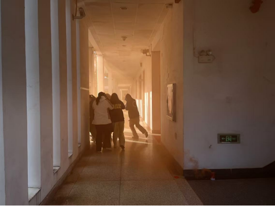 演練當日,為了逼真還原地震、火災場景,安全工作處在教學樓燃放了煙霧彈。隨著演練的開始,在第一聲信號發(fā)出后,同學們在輔導員及工作人員的帶領下做好了地震來臨時的應急避險動作,在5秒鐘之后,第二聲信號響起,全體同學掩住口鼻,快速、有序地從各間教室撤離教學樓。參加本次演練的新生共計4000余人,三場演練平均用時1分42秒,演練過程順利,服從指揮,達到了預期的效果。
