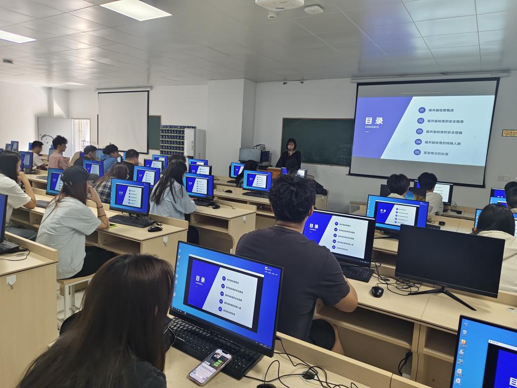 為保證演練活動安全、有序進行,工作人員事先進行周密安排,制定演練方案。本次演練分兩個部分進行。第一部分,磁共振MRI檢查安全演練。首先由醫(yī)學技術與工程學院吳沁老師集中講授實訓過程中磁共振MRI檢查安全、處理流程及預防措施。告知學生發(fā)生MRI檢查意外不要驚慌,聽從指揮,完成應急處理流程。工作人員維持現場秩序,確保實訓室無發(fā)生其他安全事件。