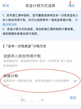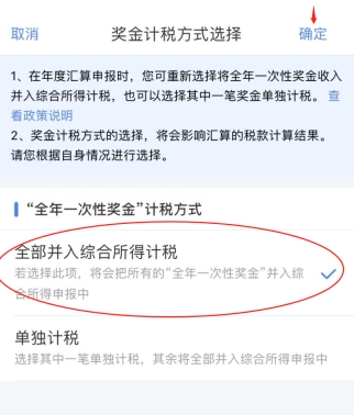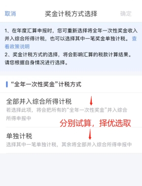 點擊“工資薪金”-“全年一次性獎金”計稅方式有“全部并入綜合所得計稅”和“單獨計稅”兩種,可以分別試算后,選最優(yōu)方式。