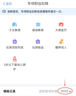 第二步:選擇扣除年度“2023”,再選擇需要填寫或修改的專項附加扣除。