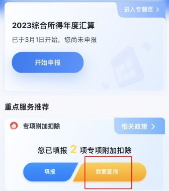 第一步:登錄“個人所得稅”APP,在“專項附加扣除”欄,點“我要查詢”,選擇查詢年度“2023”,核對本人2023年度專項附加填報信息。