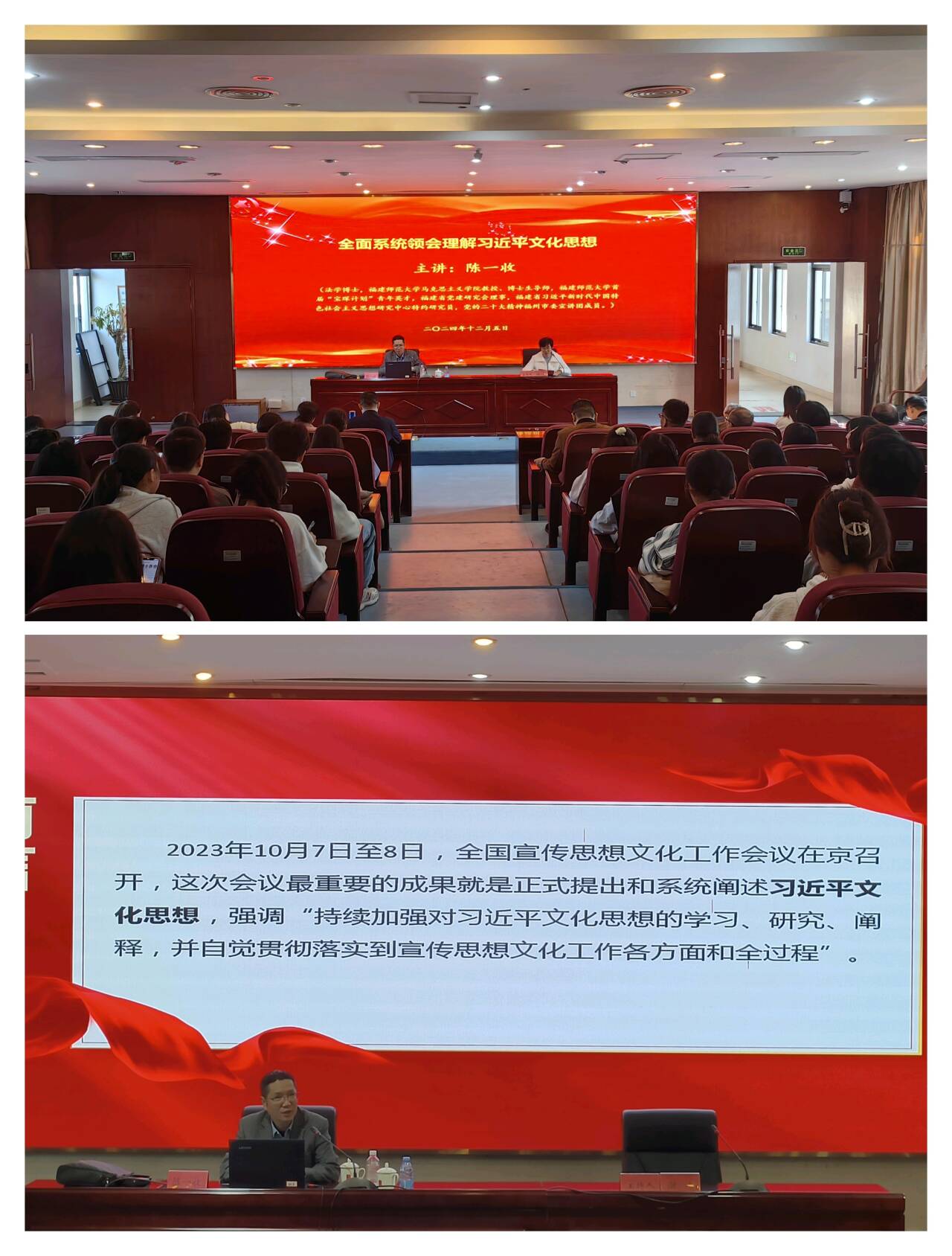 為深入貫徹黨的二十屆三中全會(huì)提出的文化建設(shè)目標(biāo),持續(xù)加強(qiáng)學(xué)習(xí)、研究、闡釋習(xí)近平文化思想,推動(dòng)文化事業(yè)創(chuàng)新發(fā)展,12月5日,我校邀請(qǐng)福建師范大學(xué)馬克思主義學(xué)院教授、博士生導(dǎo)師陳一收,在篤行樓四樓會(huì)議室開(kāi)展《全面系統(tǒng)領(lǐng)會(huì)理解習(xí)近平文化思想》專(zhuān)題講座。學(xué)校管理干部、馬克思主義學(xué)院全體專(zhuān)兼職教師、學(xué)生代表參加講座,講座由組織統(tǒng)戰(zhàn)部部長(zhǎng)謝濤主持。