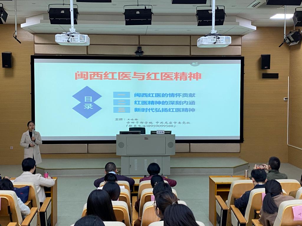 12月7日,我校邀請(qǐng)中共龍巖市委黨校(古田干部學(xué)院)王詠梅副教授到校開展《閩西紅醫(yī)與紅醫(yī)精神》主題講座。護(hù)理學(xué)院、醫(yī)學(xué)系黨員教師及積極分子代表、組織統(tǒng)戰(zhàn)部黨支部等60余人參與學(xué)習(xí)。