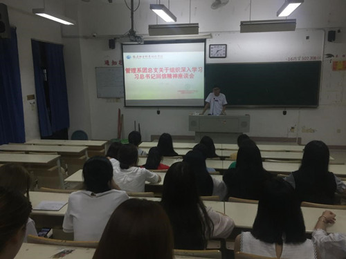 為迎接和學習宣傳貫徹黨的十九大精神,充分的學習到深刻領會習近平總書記回信的精神實質和豐富內涵,堅定理想信念,錘煉意志品質。2017年9月12日,管理系團總支書記邱麟老師組織總支委員會議,組織學習了習近平總書記給第三屆中國“互聯網+”大學生創(chuàng)新創(chuàng)業(yè)大賽“青年紅色筑夢之旅”的大學生的回信,通知安排管理系團總支四位學生委員走進2016級四個班級進行深入學習宣傳貫徹習近平總書記的回信精神。