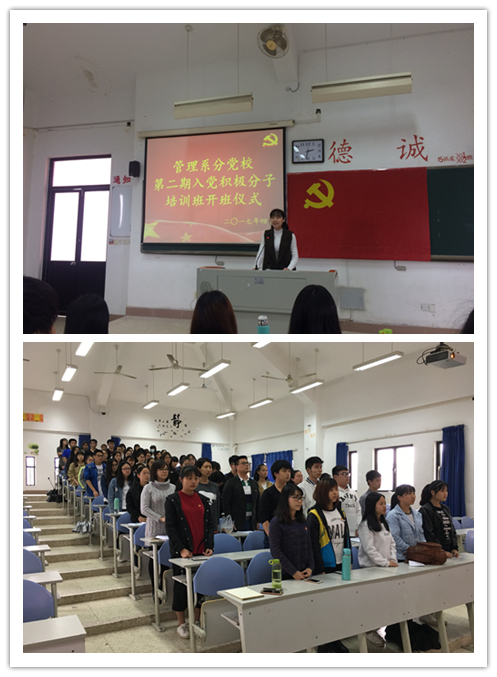 4月27日下午,管理系分黨校第二期培訓班開班儀式在教學樓309教隆重舉行。管理系黨總支艾松軍副書記,黨總支組織委員、學生黨支部書記揭金花老師,黨總支宣傳委員吳晶老師,教工黨支部書記、團總支書記邱麟老師,團總支副書記馮瑞華老師以及15級、16級部分學生先進分子參加培訓班開班儀式。