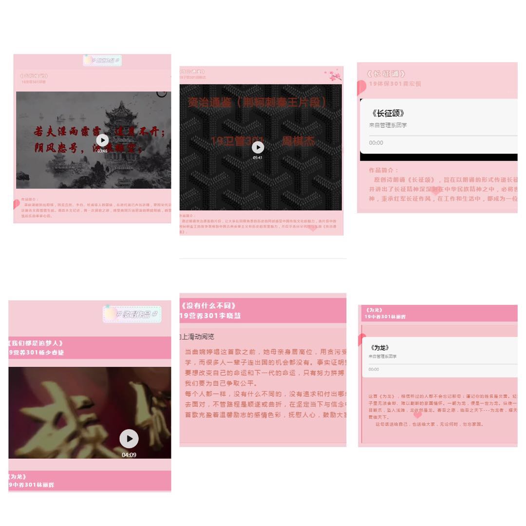 本次線上活動主要分為朗誦和歌唱兩種形式,活動受到了同學(xué)們的廣泛關(guān)注。在活動過程中,一句句慷慨激昂,氣勢恢宏的朗誦充分體現(xiàn)了當(dāng)代大學(xué)生的青春與活力;一首首耳熟能詳、熱血澎湃的歌唱充分展示了我系學(xué)子樂觀向上、積極奮進的昂揚斗志。在這個五四青年節(jié)的來臨之際,一群意氣風(fēng)發(fā)的青年者用青春描繪時代的畫卷,唱響時代的凱歌,揚起時代的風(fēng)帆,更是營造了一種樸實深情、唱響新時代的主旋律的良好氛圍,謳歌了青年學(xué)子們對中華千古風(fēng)韻與歷史遺產(chǎn)的精神面貌。以歌聲傳遞信仰、用朗誦傳承經(jīng)典,每一句詩韻和歌唱都深深表現(xiàn)出我系學(xué)子們對中華經(jīng)典的熾熱追求與敬佩。最終,(1)朗誦榜:16美容501鄭霏《岳陽樓記》,19衛(wèi)管301周棋杰《資治通鑒》,19體保301龔宏祺《長征頌》,19預(yù)防302張小龍《日出東方》,19中醫(yī)養(yǎng)生保健301曾余熙《大醫(yī)精誠》;(2)歌唱榜:19中養(yǎng)301林麗輝《為龍》,19營養(yǎng)301李婷婷《仰望星空》,19營養(yǎng)301李曉慧《沒有什么不同》,19營養(yǎng)301李夢婷《陽光總在風(fēng)雨后》,19營養(yǎng)301楊少睿捷《我們都是追夢人》作品脫穎而出。