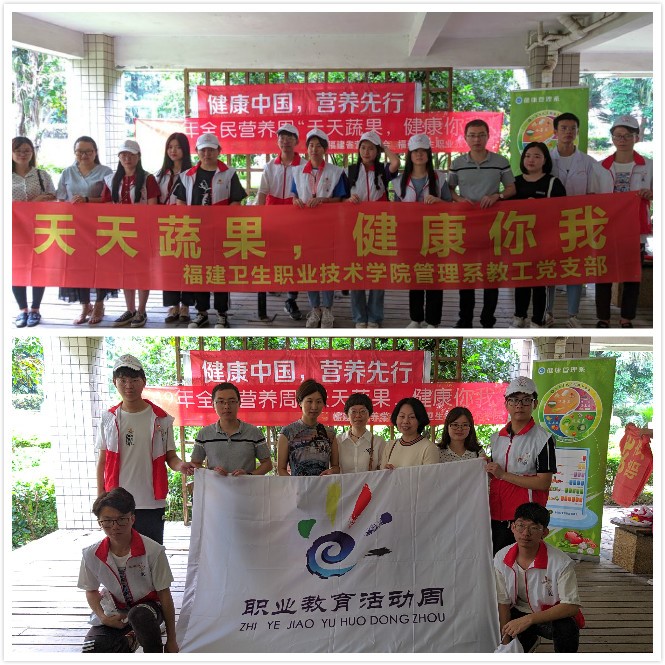 為進(jìn)一步貫徹落實黨的十九大精神,宣傳和展示職業(yè)教育成果,響應(yīng)“健康中國”戰(zhàn)略,落實以人民健康為中心,堅持以基層為重點(diǎn),以改革創(chuàng)新為動力,助力推進(jìn)健康中國建設(shè),促進(jìn)全民營養(yǎng),提高全民健康水平。5月17日,管理系教工黨支部聯(lián)合醫(yī)學(xué)營養(yǎng)教研室前往晉安區(qū)幸福城小區(qū),開展“天天果蔬,健康你我”職教體驗活動。管理系教工黨支部書記馮瑞華、組織委員王國浩,教師黨員代表吳晶、李芳琴,醫(yī)學(xué)營養(yǎng)專業(yè)帶頭人徐軼彥,醫(yī)學(xué)營養(yǎng)教研室教師蔡丹鳳以及17、18級醫(yī)學(xué)營養(yǎng)專業(yè)學(xué)生參加了此次活動。