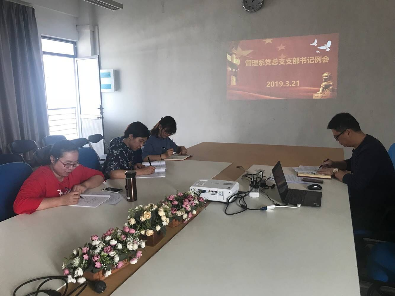3月21日,管理系黨總支在系部會(huì)議室召開黨支部書記例會(huì)。黨總支書記艾松軍主持了會(huì)議。會(huì)議上,艾書記強(qiáng)調(diào),為加強(qiáng)黨支部的建設(shè)力度,提高黨支部書記的政治素質(zhì)和業(yè)務(wù)素質(zhì),強(qiáng)化支部書記的工作意識(shí)、團(tuán)結(jié)意識(shí)和協(xié)調(diào)關(guān)系能力,進(jìn)一步提高黨支部班子的工作能力和整體工作水平,充分發(fā)揮黨支部的戰(zhàn)斗堡壘作用,每月一次的黨支部書記例會(huì)要有主題,內(nèi)容要豐富,要大膽提問題,提出解決問題的辦法,要確保每學(xué)期至一次的專學(xué)習(xí)和支部建設(shè)工作匯報(bào)。