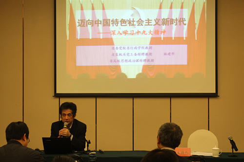 會議還邀請省委黨校行政學(xué)院教授林建華做了題為《邁向中國特色社會主義新時代-深入學(xué)習(xí)貫徹黨的十九大精神》專題講座。林建華教授從歷史成就、重大判斷、歷史使命與“四個偉大”、重大思想、基本方略等方面,對學(xué)習(xí)中共十九大精神進(jìn)行了深入淺出的解讀輔導(dǎo)。