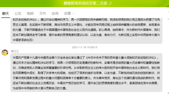 2021年11月18日,健康管理系黨總支第二支部全體黨員開展學(xué)習(xí)《中共中央關(guān)于黨的百年奮斗重大成就和歷史經(jīng)驗的決議》、《中共中央關(guān)于黨的百年奮斗重大成就和歷史經(jīng)驗的決議》、《中國共產(chǎn)黨第十九屆中央委員會第六次全體會議公報》的學(xué)習(xí)。