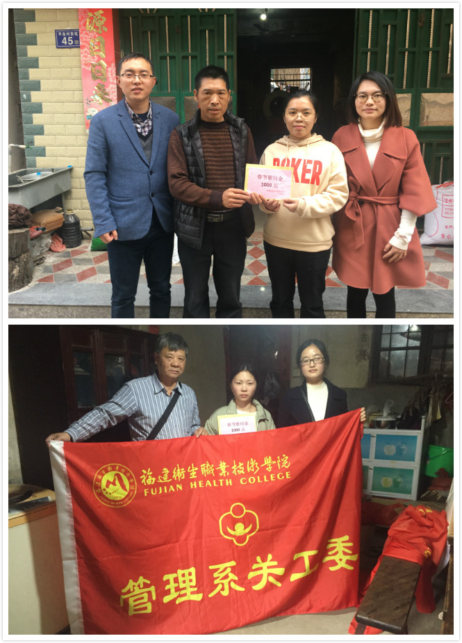 為貫徹落實(shí)高校家庭經(jīng)濟(jì)困難學(xué)生資助政策,關(guān)心貧困大學(xué)生的成長與發(fā)展。1月26-27日,管理系組織關(guān)工委領(lǐng)導(dǎo)、教師代表、輔導(dǎo)員赴閩侯縣洋里鄉(xiāng),漳州市華安縣開展“迎新春,送溫暖”慰問貧困生活動(dòng),為貧困學(xué)生家庭送上慰問金和慰問品,以及節(jié)日的祝福。讓貧困學(xué)生和家長感受來自衛(wèi)職院大家庭的溫暖。