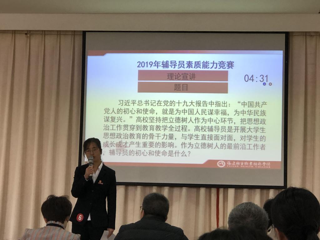 2019年12月13日,福建衛(wèi)生職業(yè)技術(shù)學(xué)院輔導(dǎo)員素質(zhì)能力大賽總決賽在行政樓6樓舉行,我系輔導(dǎo)員趙茜老師代表健康管理系參加決賽。經(jīng)過激烈的角逐,趙茜老師榮獲福建衛(wèi)生職業(yè)技術(shù)學(xué)院輔導(dǎo)員能力大賽總決賽二等獎(jiǎng)(第三名)的好成績(jī)。