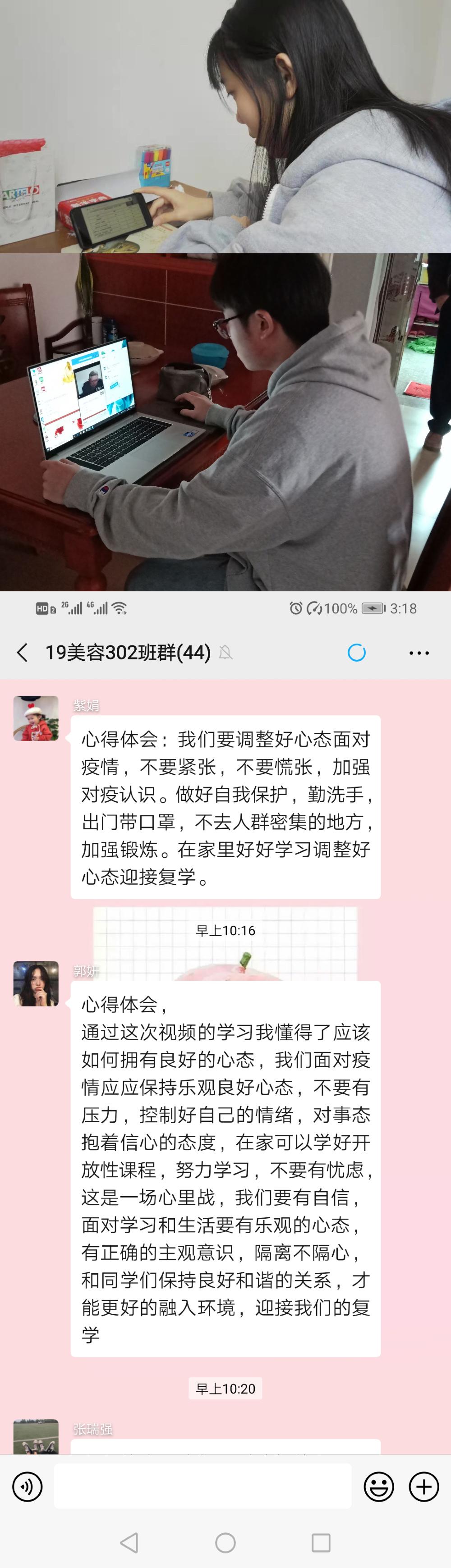 在2月10日“大學生心理應激與應對”專場培訓結束后,19健康管理302班心理委員楊詩琳同學感慨道,這場線上心理培訓真是非常及時。疫情來之兇猛,導致所有在校學生無法正常開學,這讓她為無法正常返回校園而感到焦慮,同時也為開學后疫情是否能得以控制而感到恐慌。但在《用健康的心態(tài)迎接復學》等7場課程直播的學習后,她學會了運用科學的方法來緩解心理壓力,用正確的心態(tài)去面對疫情,時刻做好返校的準備。培訓結束后,各班同學針對此次線上心理課程的學習感悟,在自己的班級群展開了熱烈的討論。