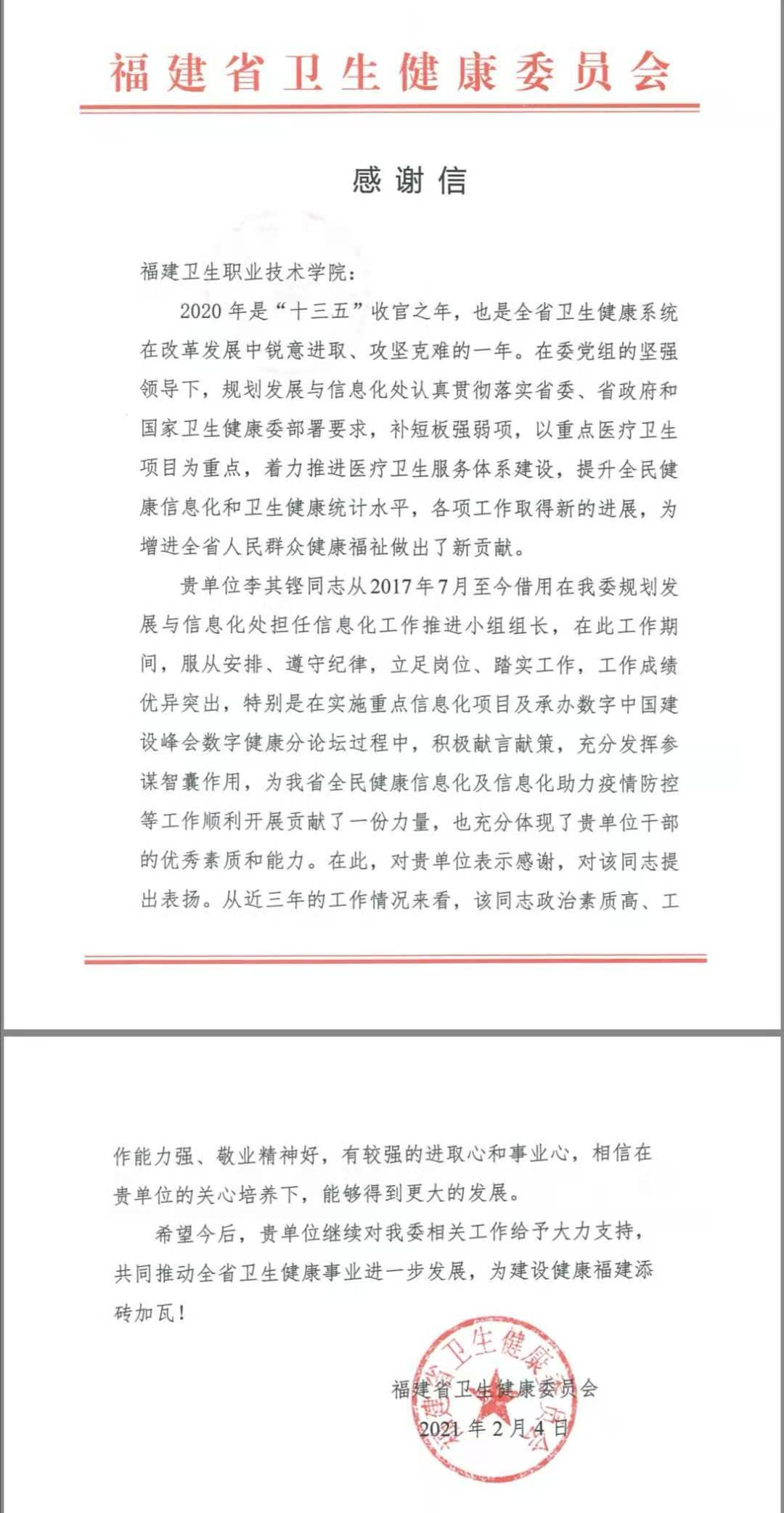 近日,福建省衛(wèi)生健康委員會向我院發(fā)來感謝信,感謝健康管理系李其鏗同志自2017年7月至今借用在規(guī)劃發(fā)展與信息化處以來,服從安排、遵守紀律、踏實工作、為我省全民健康信息化及信息化助力疫情防控等工作順利開展作出的貢獻。