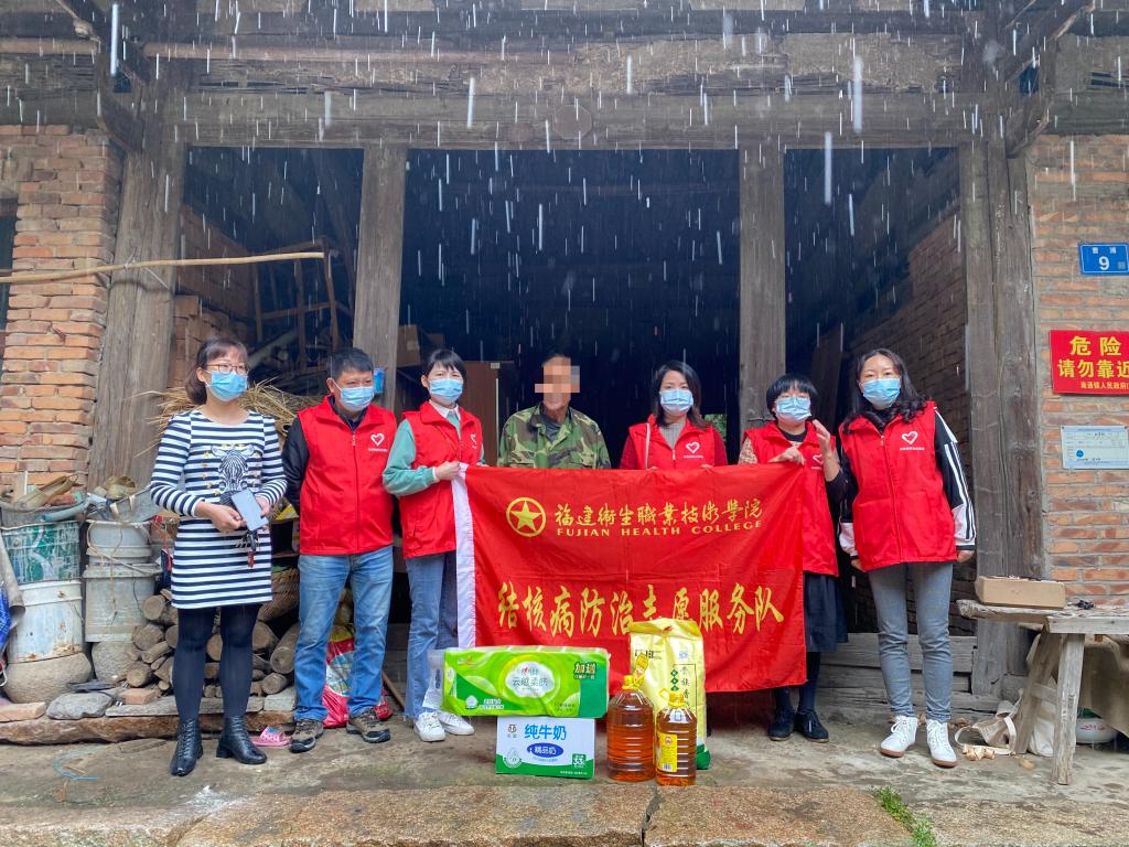 2021年11月4日,健康管理系結核病防治宣傳志愿隊同閩侯縣疾病預防控制中心志愿者們走訪慰問了閩侯縣南通鎮(zhèn)、荊溪鎮(zhèn)、甘蔗鎮(zhèn)、鴻尾鄉(xiāng)貧困結核病患者,給他們送去了關懷與溫暖。參與慰問的有福建衛(wèi)生技術學院健康管理系副書記吳燕玲、預防醫(yī)學教研室教師何泉燕,閩侯縣疾病預防控制中心副主任陳曉燕,余少丹科長,林升震醫(yī)師及當?shù)馗餍l(wèi)生院結核病防治工作人員。