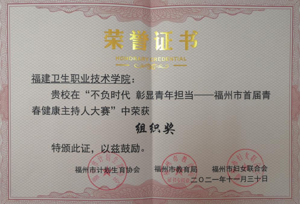 2021年11月30日,由福州市計(jì)劃生育協(xié)會(huì)、福州市教育局、福州市婦聯(lián)主辦,福州市一心社會(huì)工作服務(wù)中心協(xié)辦的“不負(fù)時(shí)代 彰顯青年擔(dān)當(dāng)——福州市首屆青春健康主持人大賽”在福州市海峽婦女兒童活動(dòng)中心一樓報(bào)告廳進(jìn)行決賽。我校青春健康同伴社成員參與此次大賽并榮獲組織獎(jiǎng)。本次比賽由健康管理專業(yè)帶頭人聶小鳳老師進(jìn)行賽前指導(dǎo)。