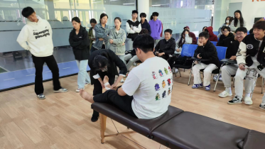 本次演練分為運動損傷處理演練和應急逃生演練(消防、地震)兩個部分。運動損傷處理演練由健康學院溫曉黛老師、魏涵銳老師現(xiàn)場講授運動損傷的應急處理流程,并現(xiàn)場進行模擬處置。
