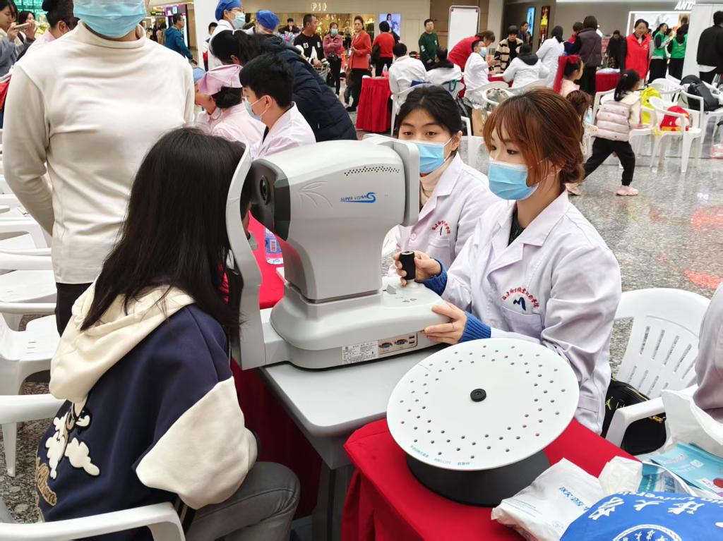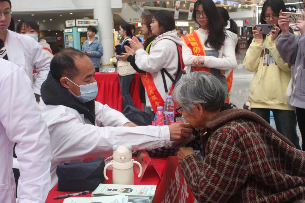 舞臺(tái)下,游戲互動(dòng)區(qū)與健康服務(wù)區(qū)同樣精彩紛呈。志愿者巧妙地將結(jié)核防治知識(shí)融入 “直擊結(jié)核要害”(投壺游戲)、“結(jié)核知識(shí)對(duì)對(duì)碰” 等趣味游戲中,同時(shí)還設(shè)置了繪畫(huà)、中醫(yī)(植物)拓印、創(chuàng)意扭扭棒等特色活動(dòng),吸引了現(xiàn)場(chǎng)觀眾踴躍參與。這些別出心裁的游戲,有效地增強(qiáng)了群眾的健康意識(shí)。為切實(shí)滿足群眾的健康需求,支部特邀多家醫(yī)院及社區(qū)衛(wèi)生服務(wù)中心開(kāi)展健康義診。支部師生充分發(fā)揮專(zhuān)業(yè)優(yōu)勢(shì),提供面部皮膚測(cè)試、眼健康檢查等多樣化健康咨詢服務(wù),同步進(jìn)行海姆立克急救法、心肺復(fù)蘇技能的演示教學(xué),以豐富多元的服務(wù)形式,提升民眾的健康管理意識(shí)與素養(yǎng)。