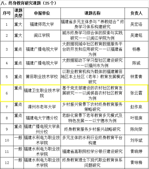 根據(jù)《福建省教育廳福建省財政廳關(guān)于開展2018-2020年福建省終身教育重點項目建設(shè)工作的通知》(閩教職成〔2018〕36號)文件精神,我系教師黨員張云霞老師積極申報2019年課題項目,所主持的《基于黨支部建設(shè)的農(nóng)村社區(qū)教育發(fā)展研究——以閩侯縣農(nóng)村社區(qū)教育為例》課題于近日入選第二批全省終身教育研究重點課題,特此祝賀!