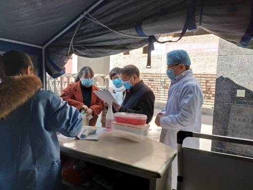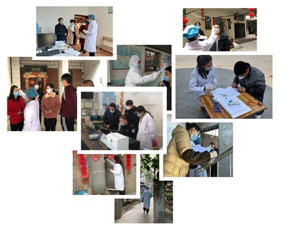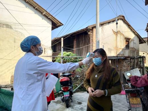 (圖為:預(yù)防班周銀華(左二)參與外來人員復(fù)工體溫檢測工作)