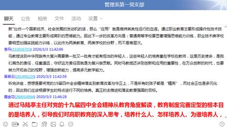 馬主任在解讀文件的基礎(chǔ)上,增加了自己的見解,形象生動(dòng)的為我們上了一堂課,使我們受益匪淺。觀看完講座后,支部黨員積極發(fā)言,在線討論,發(fā)表觀后感。管理系第一黨支部副書記揭金花老師表示通過馬陸亭主任對(duì)黨的十九屆四中全會(huì)精神從教育角度解讀,教育制度完善定型的根本目的是培養(yǎng)人,引導(dǎo)我們對(duì)高職教育的深入思考,培養(yǎng)什么人、怎樣培養(yǎng)人、為誰培養(yǎng)人,在具體的教育教學(xué)活動(dòng)中更要注重素質(zhì)教育,特別重視學(xué)生的社會(huì)責(zé)任感、創(chuàng)新精神和實(shí)踐能力培養(yǎng)。立德樹人是綜合概念,是根本任務(wù),以德為先,能力為重,培養(yǎng)德智體美勞全面發(fā)展的人才,為人民服務(wù)。德育作為醫(yī)學(xué)人才培養(yǎng)的首要內(nèi)容,將思想政治教育和醫(yī)學(xué)職業(yè)素養(yǎng)教育貫穿人才培養(yǎng)全過程,更要以此次疫情防控斗爭中廣大醫(yī)務(wù)工作者為榜樣教育學(xué)生,著力培養(yǎng)學(xué)生“珍愛生命、大醫(yī)精誠”的救死扶傷精神,引導(dǎo)學(xué)生將預(yù)防疾病、解除病痛和維護(hù)群眾健康作為自己的神圣職責(zé)。能力為重培養(yǎng)具有仁術(shù)的醫(yī)學(xué)人才。要把醫(yī)學(xué)生崗位勝任能力培養(yǎng)作為改革重點(diǎn),以高水平的臨床實(shí)踐體系建設(shè)促進(jìn)醫(yī)學(xué)生在實(shí)踐中練就過硬本領(lǐng)。溫曉黛老師表示教育制度的改革不是一蹴而就的,要有步驟有計(jì)劃,根據(jù)學(xué)生特點(diǎn),逐步過度,將職業(yè)教育發(fā)展成符合時(shí)代特色的,實(shí)踐性強(qiáng)的,真正為國家培養(yǎng)職業(yè)人才。李芳琴老師表示我們要采取多種教育方式,不能用一種教育規(guī)律代替一切,要擺脫單純的知識(shí)點(diǎn)學(xué)習(xí),加強(qiáng)技能和思維訓(xùn)練,尤其是醫(yī)學(xué)院校的高等職業(yè)教育,要充分利用教育制度的優(yōu)勢特征,發(fā)展職業(yè)教育。