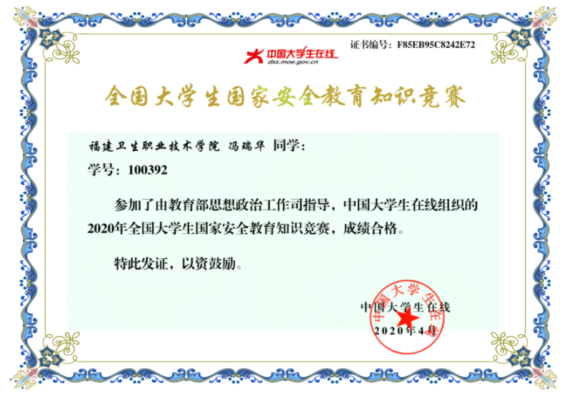 在認(rèn)真學(xué)習(xí)了“2020同上一堂國(guó)家安全教育課”以后,廣大師生黨員,紛紛參與國(guó)家安全知識(shí)競(jìng)賽,并獲得了·全國(guó)大學(xué)生國(guó)家安全教育知識(shí)競(jìng)賽證書。