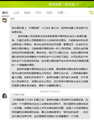 5月7日,管理系第二黨支部依托學(xué)習(xí)強國平臺開展以“治國理政大家讀”為主題的系列活動,系統(tǒng)學(xué)習(xí)貫徹黨的十九屆四中全會精神,更全面、深入的學(xué)習(xí)中國特色社會主義制度和國家治理體系優(yōu)勢,為決戰(zhàn)決勝脫貧攻堅戰(zhàn)和全面建成小康社會增強制度自信。