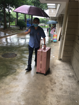 校園內(nèi),不僅有暴雨,更有關(guān)愛???,那邊王國浩老師正在幫忙提行李。