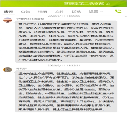 6月11日,管理系第二黨支部借助學(xué)習(xí)強(qiáng)國(guó)平臺(tái)學(xué)習(xí)了十九屆四中全會(huì)精神——中國(guó)制度十三講中的第七講:堅(jiān)持和完善統(tǒng)籌城鄉(xiāng)的民生保障制度,滿足人民日益增長(zhǎng)的美好生活需要。黨的十九屆四中全會(huì)提出,必須健全幼有所育、學(xué)有所教、勞有所得、病有所醫(yī)、老有所養(yǎng)、住有所居、弱有所扶等方面國(guó)家基本公共服務(wù)制度體系,注重加強(qiáng)普惠性、基礎(chǔ)性、兜底性民生建設(shè),保障群眾基本生活,滿足人民多層次多樣化需求,使改革發(fā)展成果更多更公平惠及全體人民。