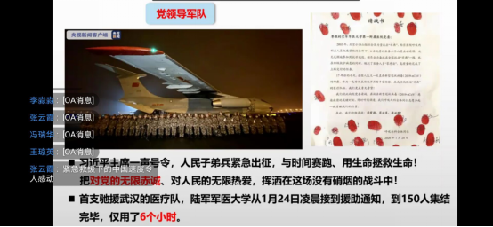 疫情期間廣大共產(chǎn)黨人、醫(yī)務(wù)工作者等沖鋒在前,無私奉獻(xiàn),彰顯中國特色社會主義制度群防群治的治理優(yōu)勢。黨對人民軍隊絕對領(lǐng)導(dǎo)的獨特優(yōu)勢及中國助力全球抗疫,推動構(gòu)建人類命運共同體,彰顯出中國的大國擔(dān)當(dāng)和國際優(yōu)勢。