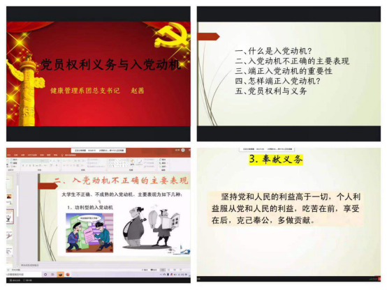 2021年2月21日,健康管理系分黨校在線上開展《黨員權(quán)利義務(wù)與入黨動(dòng)機(jī)》專題黨課,此次課程由團(tuán)總書記趙茜老師為全體學(xué)員進(jìn)行培訓(xùn)。趙茜老師圍繞以下五個(gè)內(nèi)容:(1)什么是入黨動(dòng)機(jī);(2)入黨動(dòng)機(jī)不正確的主要表現(xiàn);(3)端正入黨動(dòng)機(jī)的重要性;(4)怎樣端正入黨動(dòng)機(jī);(5)黨員權(quán)利與義務(wù)展開本節(jié)課主要內(nèi)容。