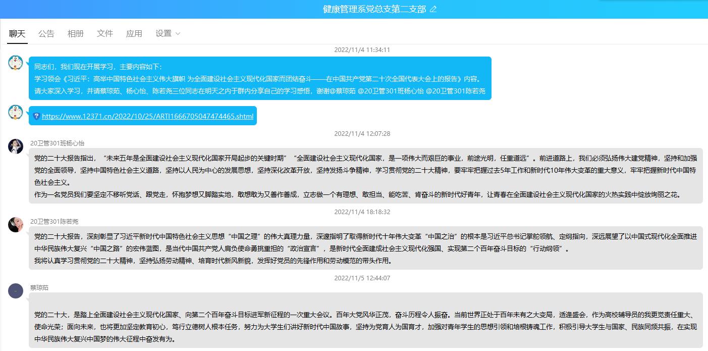 為深入宣傳貫徹黨的二十大精神,2022年11月4日健康管理系黨總支第二支部召開(kāi)學(xué)習(xí)黨的二十大報(bào)告學(xué)習(xí)分享會(huì)議,會(huì)議在線上舉行,會(huì)議由支部書記張凱捷主持。