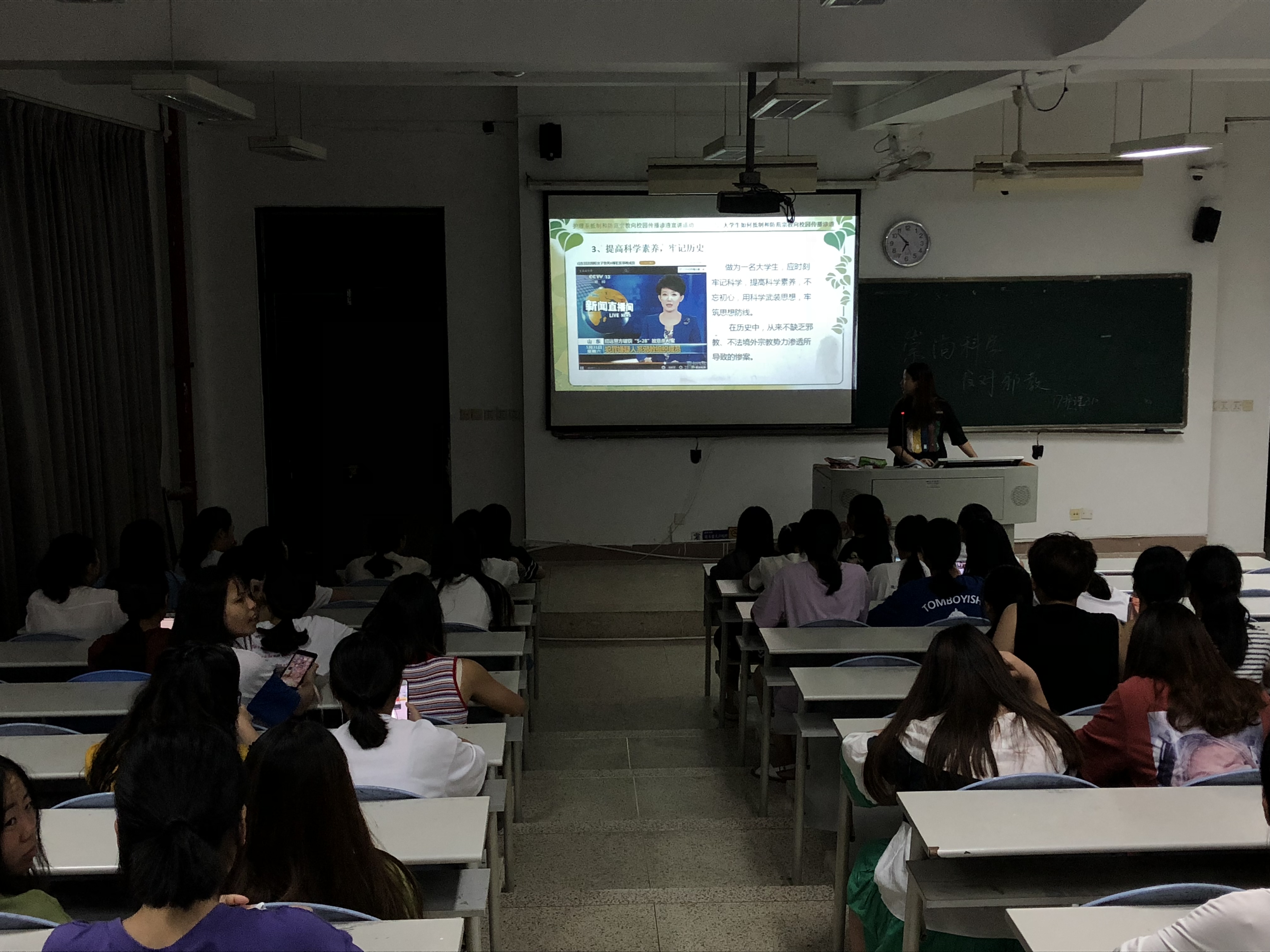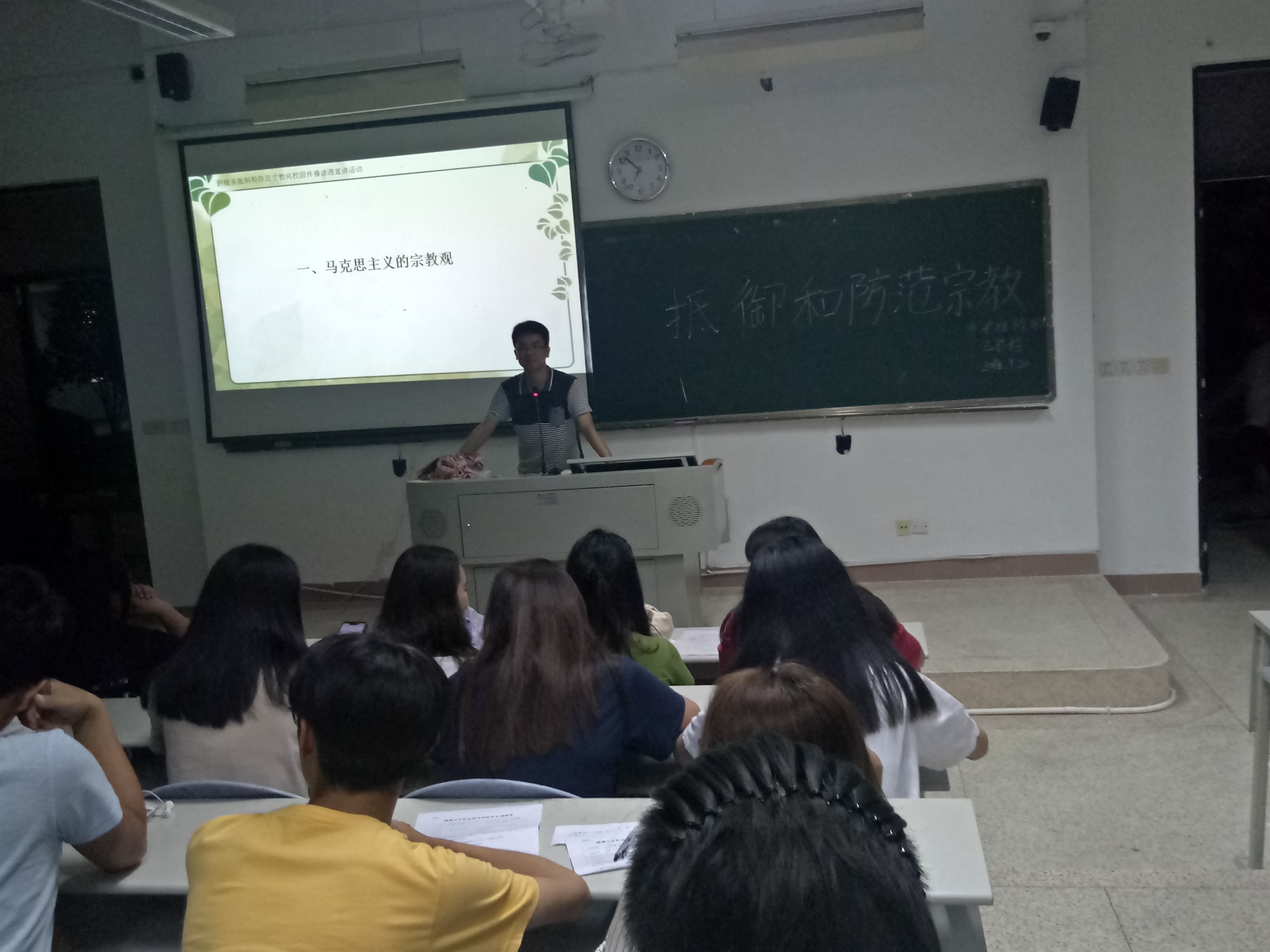 通過(guò)大宣講活動(dòng),使同學(xué)們進(jìn)一步樹(shù)立堅(jiān)定的共產(chǎn)主義理想信念,并正確認(rèn)識(shí)宗教、了解宗教,加強(qiáng)了對(duì)黨和國(guó)家的宗教政策及有關(guān)法律法規(guī)的學(xué)習(xí),以破除他們對(duì)宗教的盲目或神秘感,使同學(xué)們明白,校園是傳播社會(huì)主義精神文明的陣地,不允許任何組織和個(gè)人利用任何方式,在校園從事任何宗教活動(dòng),進(jìn)一步增強(qiáng)了我系師生抵御和防范宗教向校園傳播滲透的意識(shí)和自覺(jué)性,筑牢抵御和防范宗教向校園滲透的思想防線。