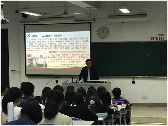 2018年4月10號(hào),曾武祈書記走進(jìn)思政課堂,為我系學(xué)生講授以“征程新時(shí)代 召喚新青年 勇?lián)率姑睘橹黝}的形勢(shì)政策課。