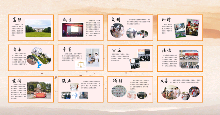 我系利用班會(huì)、講座、宣傳板報(bào)、線上多媒體等多種方式向全系師生宣傳解讀社會(huì)主義核心價(jià)值觀,號(hào)召全系師生爭(zhēng)做一名愛國(guó)守法、勤奮好學(xué)、明禮誠(chéng)信、團(tuán)結(jié)友善、敬業(yè)奉獻(xiàn)的人,以滿腔熱情積極投身到學(xué)習(xí)踐行社會(huì)主義核心價(jià)值觀的活動(dòng)中去,將其內(nèi)化于思想、外化于行動(dòng),立足現(xiàn)在,放眼未來,自覺踐行社會(huì)主義核心價(jià)值觀。