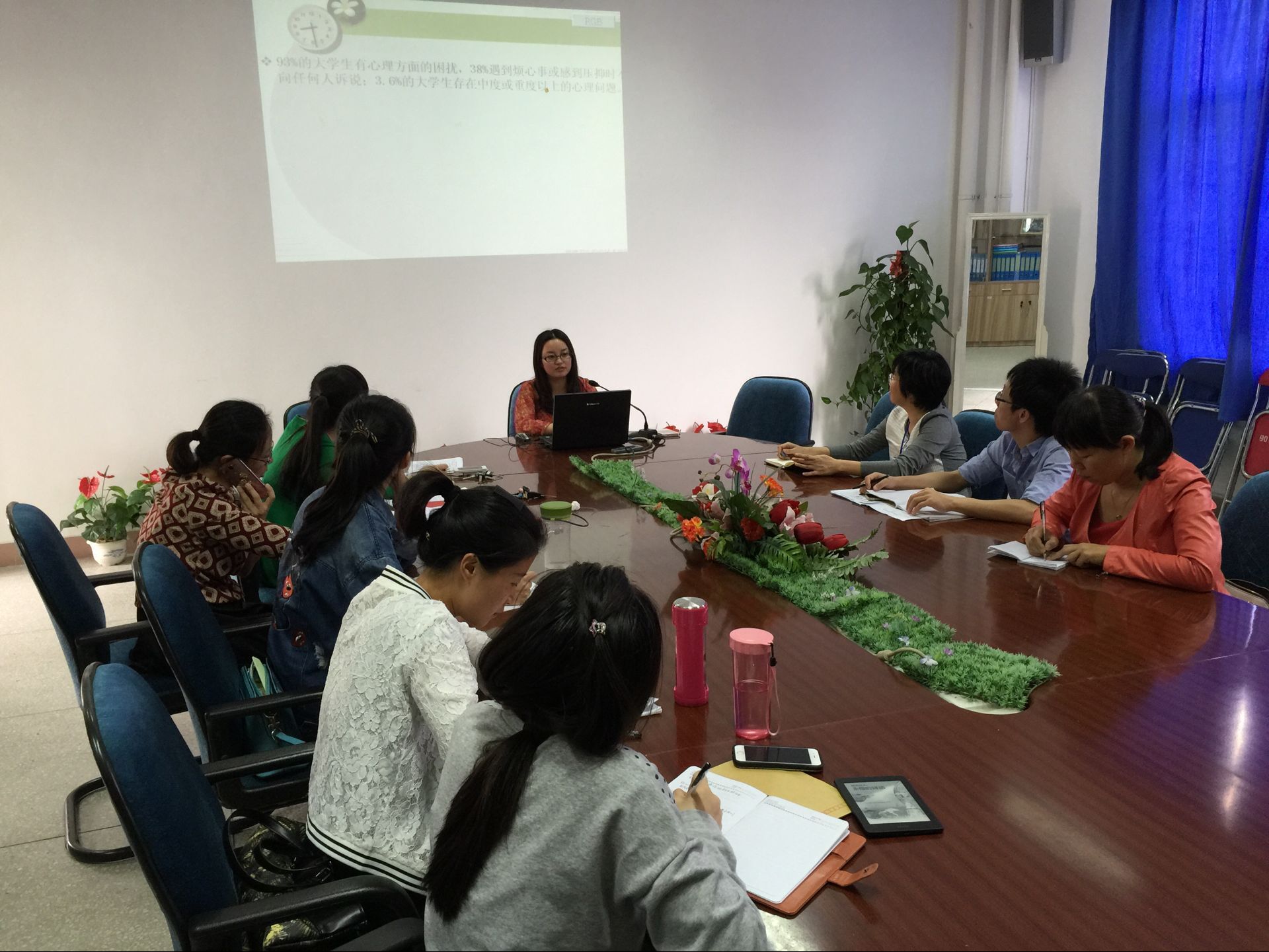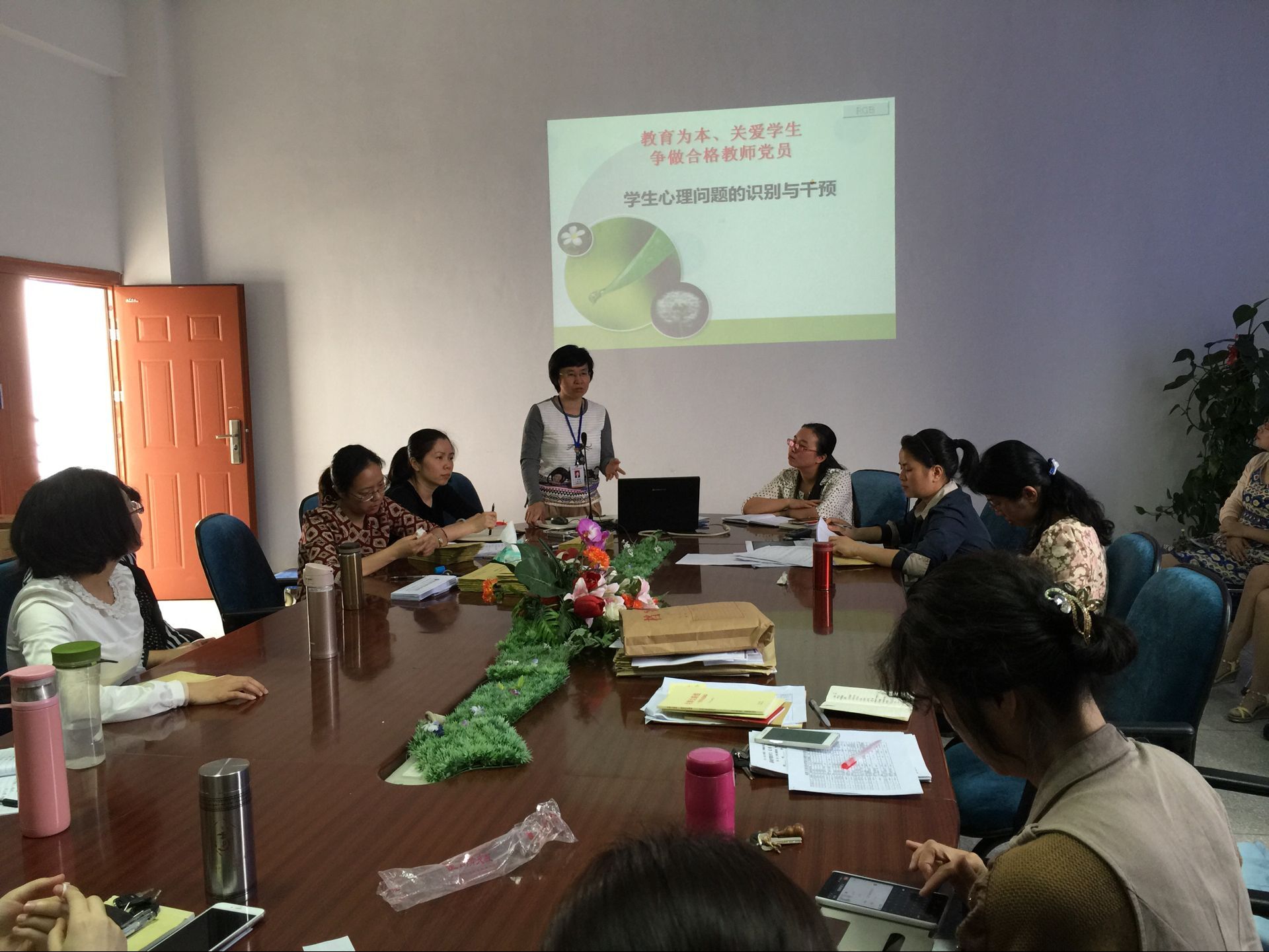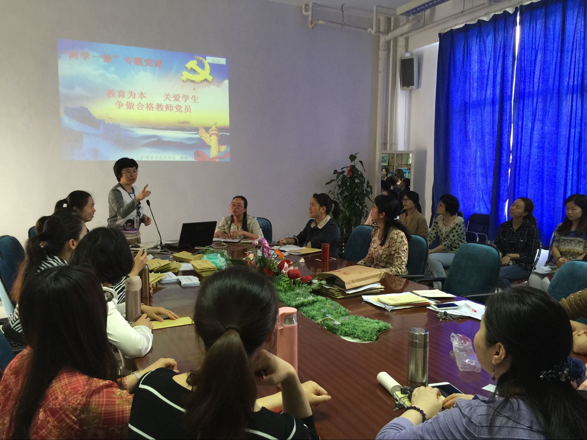 2016年5月17日下午,護理系黨總支開展了“兩學一做”學習專題黨課??傊浿x濤授課,以“‘教育為本,關(guān)愛學生;爭做合格教師黨員’——學生的心理問題識別和干預”為主題,對全系教師黨員進行了專題教育輔導。