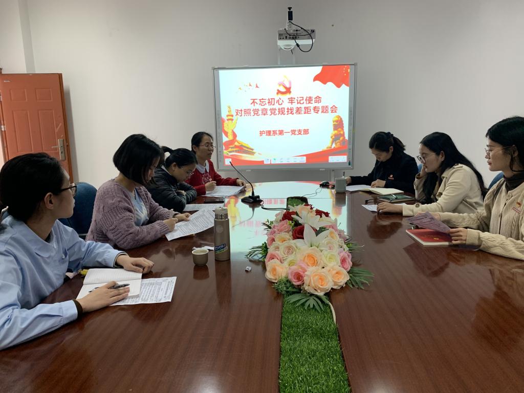 2019年11月28日,護(hù)理系第一黨支部召開對照黨章黨規(guī)找差距專題會議,會議由支部書記賈箐箐同志主持。按照學(xué)院“不忘初心、牢記使命”主題教育工作安排與要求,支部黨員認(rèn)真學(xué)習(xí)貫徹習(xí)近平新時代中國特色社會主義思想,圍繞“守初心、擔(dān)使命,找差距、抓落實(shí)”的總要求,對照黨章、《關(guān)于新形勢下黨內(nèi)政治生活的若干準(zhǔn)則》和《中國共產(chǎn)黨紀(jì)律處分條例》,以正視問題的自覺和刀刃向內(nèi)的勇氣,逐一查找問題,真刀真槍解決問題。