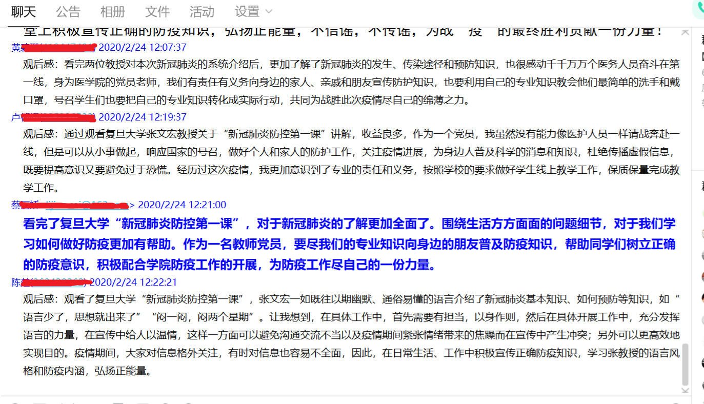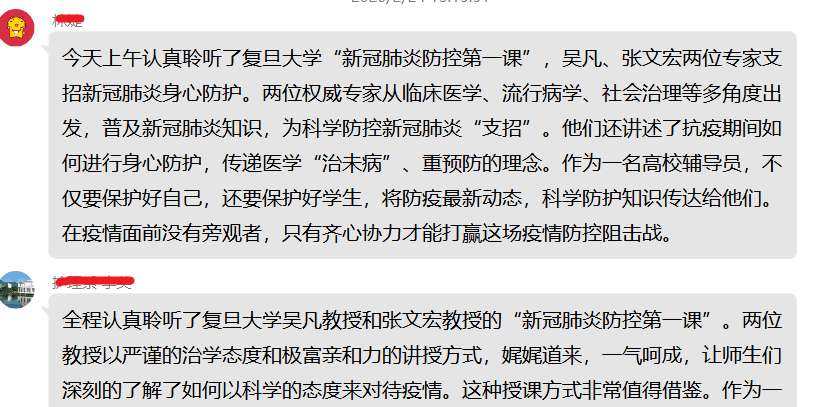 2020年2月24日上午,護(hù)理系全體師生在線觀看了復(fù)旦大學(xué)“新冠肺炎防控第一課”網(wǎng)絡(luò)直播課,線上聆聽(tīng)“疾控女俠”吳凡和“硬核教授”張文宏兩位專家講述“新冠肺炎防控第一課”。線上聆聽(tīng)完兩位專家的講授,護(hù)理系黨總支馬上組織黨員師生對(duì)“新冠肺炎防控第一課”進(jìn)行線上學(xué)習(xí)研討。黨員同志們針對(duì)今天的學(xué)習(xí)紛紛發(fā)表了各自的體會(huì),收獲頗豐。