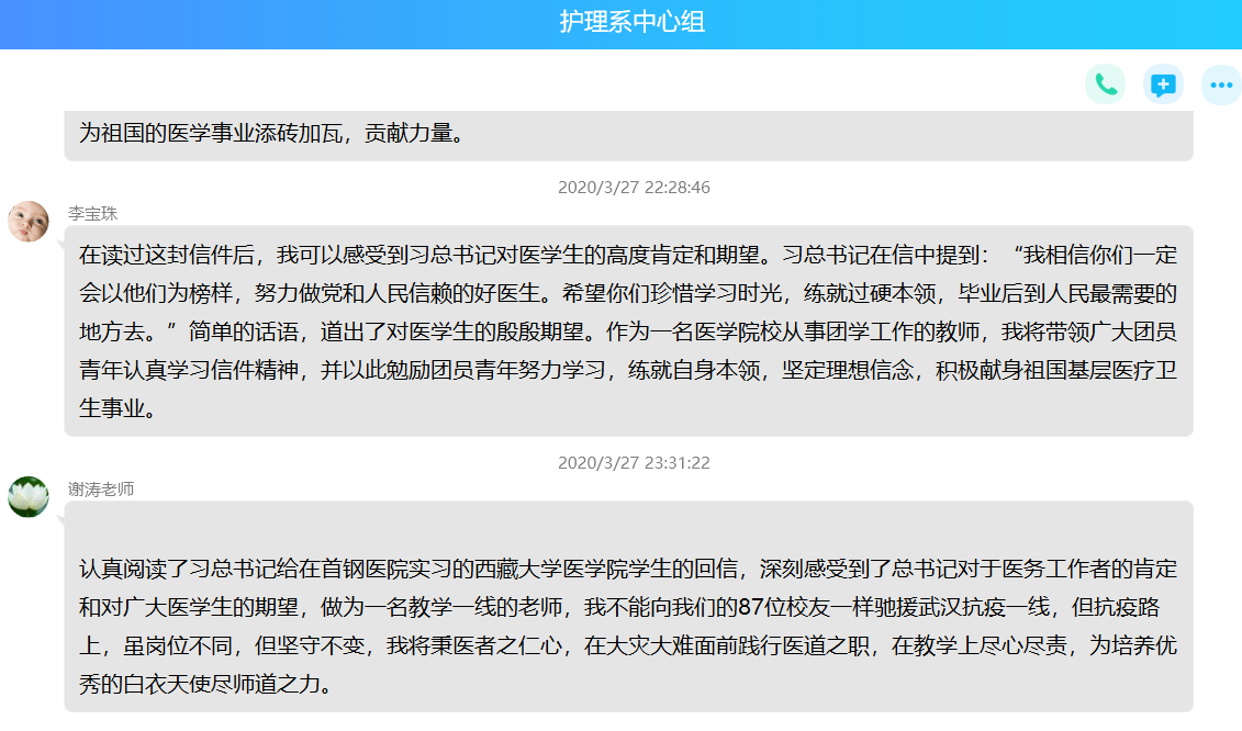 會(huì)上,謝濤同志表示,習(xí)近平總書記給在首鋼醫(yī)院實(shí)習(xí)的西藏大學(xué)醫(yī)學(xué)院學(xué)生的回信中指出,希望你們珍惜學(xué)習(xí)時(shí)光,練就過硬本領(lǐng),畢業(yè)后到人民最需要的地方去,以仁心仁術(shù)造福人民特別是基層群眾。這不僅是總書記對(duì)西藏大學(xué)醫(yī)學(xué)院學(xué)生們的鼓勵(lì)期望,也是對(duì)廣大青年的深切關(guān)懷和殷切囑托。通過認(rèn)真閱讀《習(xí)近平總書記給首鋼醫(yī)院實(shí)習(xí)的西藏大學(xué)醫(yī)學(xué)院學(xué)生的回信》,深刻感受到了總書記對(duì)于醫(yī)務(wù)工作者的肯定和對(duì)廣大醫(yī)學(xué)生的期望,做為一名教學(xué)一線的老師,雖不能像此次馳援武漢抗疫一線的87位校友一樣,但抗疫路上,雖崗位不同,但堅(jiān)守不變。希望廣大教師秉醫(yī)者之仁心,在大災(zāi)大難面前踐行醫(yī)道之職,在教學(xué)上盡心盡責(zé),為培養(yǎng)優(yōu)秀的白衣天使盡師道之力。其他同志也紛紛發(fā)表學(xué)習(xí)體會(huì)。