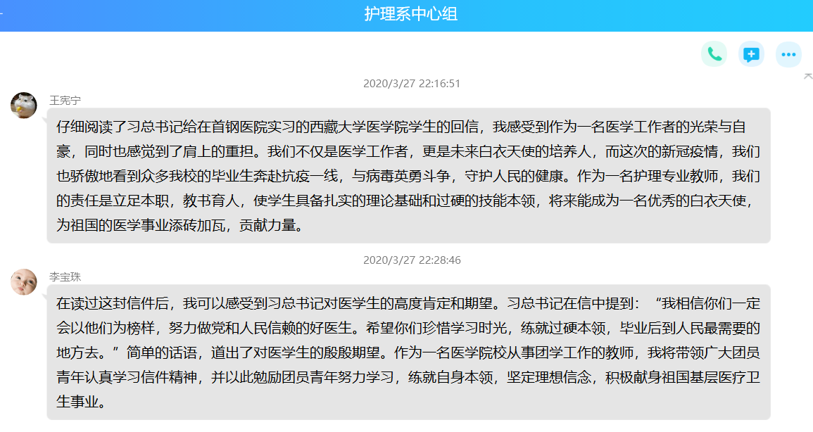 王憲寧同志表示,仔細(xì)閱讀了習(xí)近平總書記給在首鋼醫(yī)院實(shí)習(xí)的西藏大學(xué)醫(yī)學(xué)院學(xué)生的回信,我感受到作為一名醫(yī)學(xué)工作者的光榮與自豪,同時(shí)也感覺到了肩上的重?fù)?dān)。我們不僅是醫(yī)學(xué)工作者,更是未來白衣天使的培養(yǎng)人,而這次的新冠疫情,我們也驕傲地看到眾多我校的畢業(yè)生奔赴抗疫一線,與病毒英勇斗爭,守護(hù)人民的健康。作為一名護(hù)理專業(yè)教師,我們的責(zé)任是立足本職,教書育人,使學(xué)生具備扎實(shí)的理論基礎(chǔ)和過硬的技能本領(lǐng),將來能成為一名優(yōu)秀的白衣天使,為祖國的醫(yī)學(xué)事業(yè)添磚加瓦,貢獻(xiàn)力量。