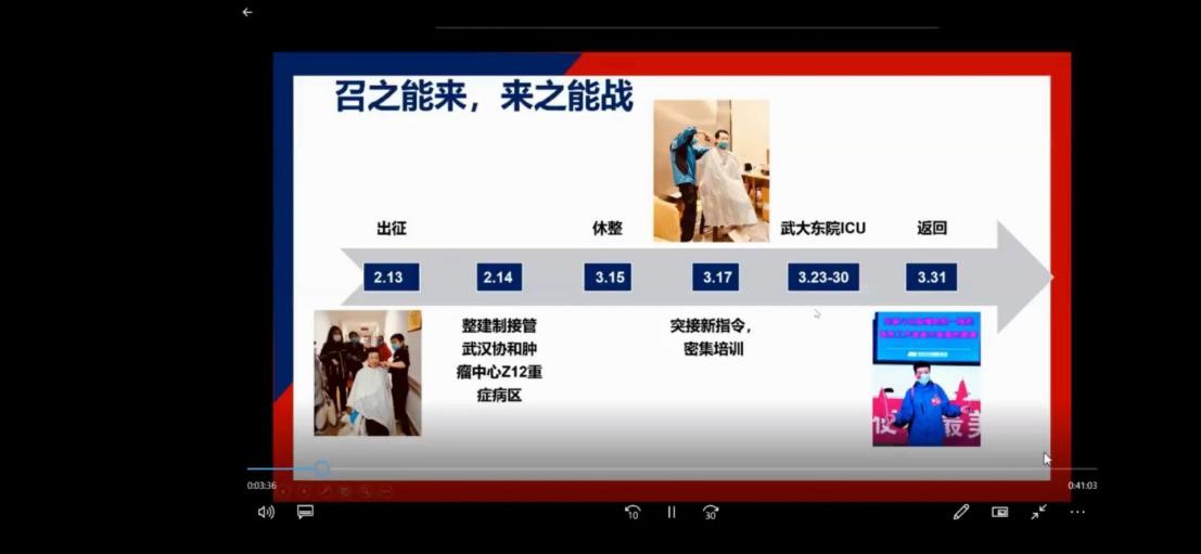 接著,危艷萍老師向大家生動(dòng)細(xì)致的分享自己的“從戰(zhàn)”經(jīng)歷,危艷萍老師2020年2月12日遞交請(qǐng)戰(zhàn)書,2月13日晚接到第二天就要出發(fā)武漢的通知,疫情就是命令,防控就是責(zé)任,危艷萍老師和眾多醫(yī)護(hù)工作者一樣,毫不猶豫的踏上奔赴武漢的戰(zhàn)場。剛到武漢時(shí),防護(hù)物資還很緊張,沒有靴套就用醫(yī)療垃圾袋,外科手套不足就用檢查手套,到后來防護(hù)物資才逐漸充裕。令危艷萍老師最難忘的還是穿著防護(hù)服每天工作7、8個(gè)小時(shí),衣服干了又濕,濕了又干。防護(hù)口罩勒的耳朵感覺快要掉了,護(hù)目鏡壓得鼻梁、顴骨持續(xù)疼痛,厚厚的防護(hù)服悶得她喘不上氣。那些平時(shí)簡單輕松就能完成的工作變得困難重重,干什么都有費(fèi)力感。人也容易疲勞,有一次蹲下休息,差點(diǎn)站不起來,但忙起來所有的不適也就忘了。