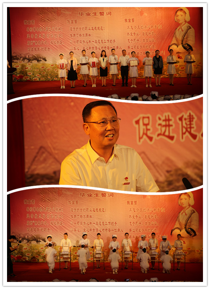 授帽傳光結(jié)束后,全體畢業(yè)生在護理系吳婷婷老師的帶領(lǐng)下齊聲宣讀畢業(yè)誓言。莊嚴的宣誓,鏗鏘有力的聲音久久縈繞在會場上空,昭示著她們正式加入白衣天使的行列。其后,學生代表丁冠初和楊情情同學情緒激昂,感情真切,對學校與老師的關(guān)心和栽培表達了深摯的感激之情;教師代表吳美丹老師深情地回憶了同學們在成長中的點滴進步和許多平凡的感動,并向同學們提出了殷切的期望。今年,護理系還特別邀請了家長代表到場,兩位家長代表分別發(fā)言,表達了對學校和老師的感激之情,也提出了對孩子的期望。學生向家長獻上鮮花并熱烈擁抱,現(xiàn)場場面溫馨感人,傳遞著感動、感恩的暖意,令所有人動容,將畢業(yè)典禮推向高潮。