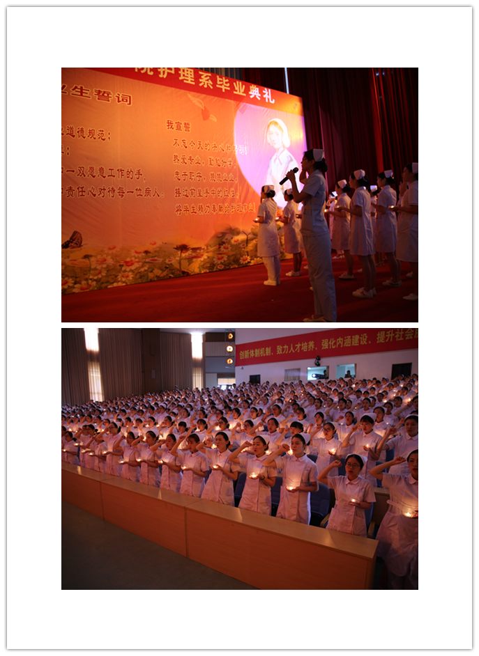 畢業(yè)典禮在雄壯的國歌聲中拉開序幕。首先由教務(wù)處姜華萍處長宣讀2018屆畢業(yè)生名單、優(yōu)秀畢業(yè)生名單和職業(yè)技能能手的表彰決定,諸位領(lǐng)導為他們頒發(fā)證書,希望受表彰的同學再接再厲,在新的崗位上建功立業(yè)。接下來,由五位資深護理前輩朱靜露教授、護理系原系主任劉登蕉教授、護理系原系副主任劉珍紅副教授、學院副院長鄭翠紅教授、護理系副主任龔海蓉副教授老師為畢業(yè)生授帽、傳光。在護理學創(chuàng)始人南丁格爾像前,畢業(yè)生單膝跪在護理老師面前,護理前輩們?yōu)楫厴I(yè)生戴上象征著圣潔天使的燕尾帽,畢業(yè)生接過老師手中象征南丁格爾精神的奉獻之火。輕柔的音樂、柔和的燈光,白色的燕尾帽在燭光的映襯下猶如神圣的光環(huán)照耀在每一個現(xiàn)場師生的心中。