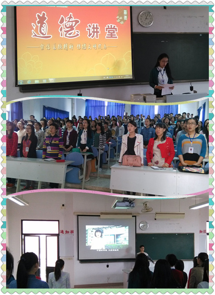 為深入學(xué)習(xí)貫徹黨的十八大精神,扎實推進(jìn)社會主義核心價值體系建設(shè),提升師生道德素質(zhì)和校園文明程度,引導(dǎo)廣大學(xué)生遵守公共道德,提升道德素質(zhì),共建和諧校園,護(hù)理系于2014年11月25日下午在教學(xué)樓209 舉辦了以“講道德、倡善行、樹新風(fēng),建設(shè)魅力校園”為主題的道德講堂活動。護(hù)理系黨總支謝濤書記、各班級輔導(dǎo)員以及護(hù)理系學(xué)生參加了本次活動。