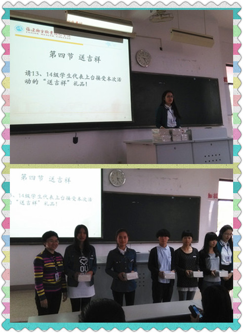 本次活動主要分為兩個環(huán)節(jié)。第一環(huán)節(jié)于10月30日晚6:30在學(xué)術(shù)廳聘請福建農(nóng)林大學(xué)馬克思主義學(xué)院副書記、副院長劉新玲教授進(jìn)行《公共生活中的道德》講座;第二環(huán)節(jié)分以歌唱《公民道德歌》、朗讀《公民道德三字經(jīng)》、談聆聽講座的感悟、送吉祥(發(fā)放小禮品)、行善舉(請同學(xué)們課后在校園里行一個善舉)這五個環(huán)節(jié)來進(jìn)行。