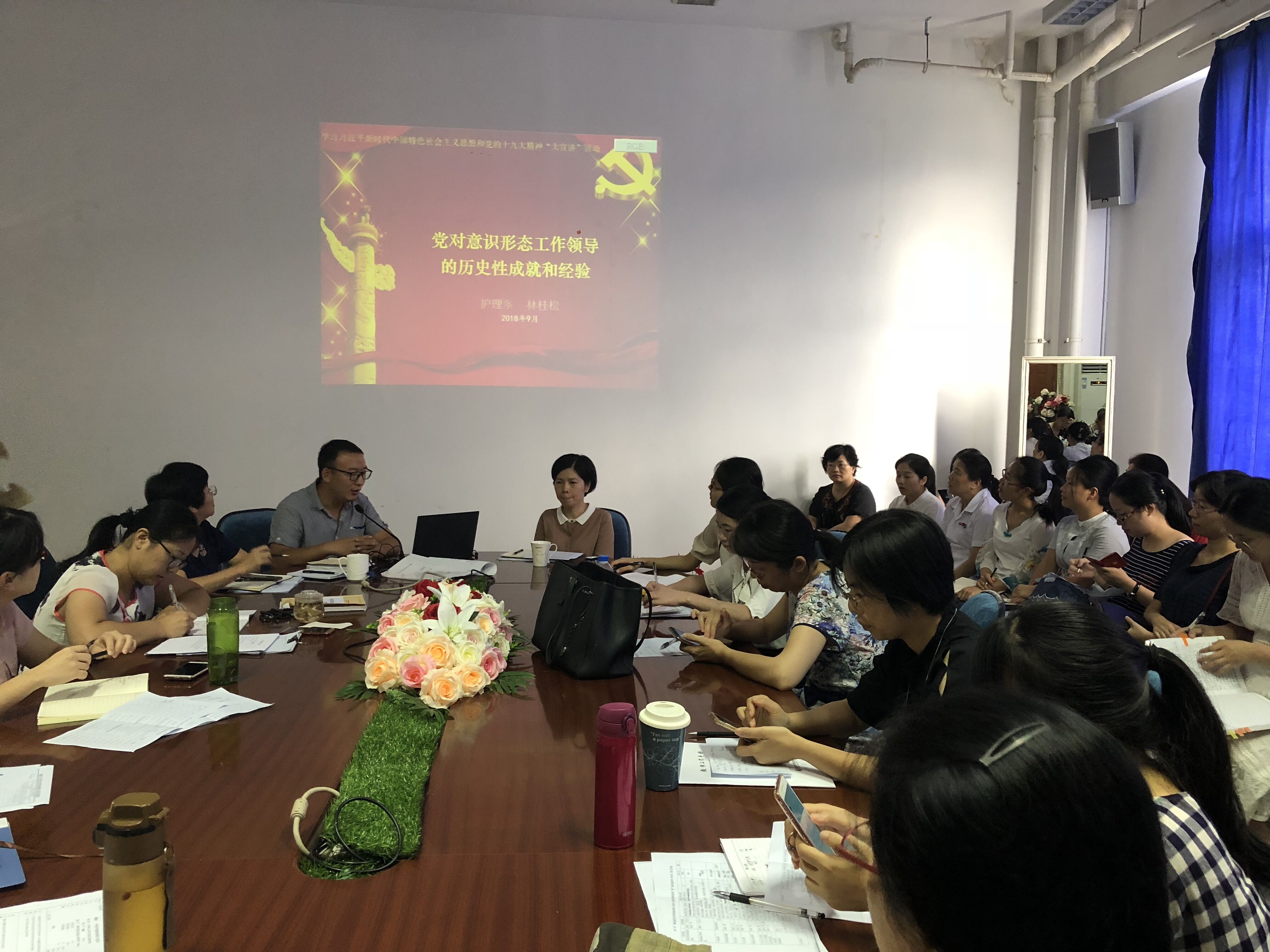 為深入學(xué)習(xí)貫徹習(xí)近平新時(shí)代中國(guó)特色社會(huì)主義思想和黨的十九大精神,按照學(xué)院《開(kāi)展習(xí)近平新時(shí)代中國(guó)特色社會(huì)主義思想“大宣講”工作方案》的要求與安排,9月13日下午,護(hù)理系在301會(huì)議室舉辦專題黨課,護(hù)理系林桂松副書記為護(hù)理系全體黨員干部職工做了以“黨對(duì)意識(shí)形態(tài)工作領(lǐng)導(dǎo)的歷史成就和經(jīng)驗(yàn)”為專題的黨課,護(hù)理系全體教職工認(rèn)真聽(tīng)取的黨課。