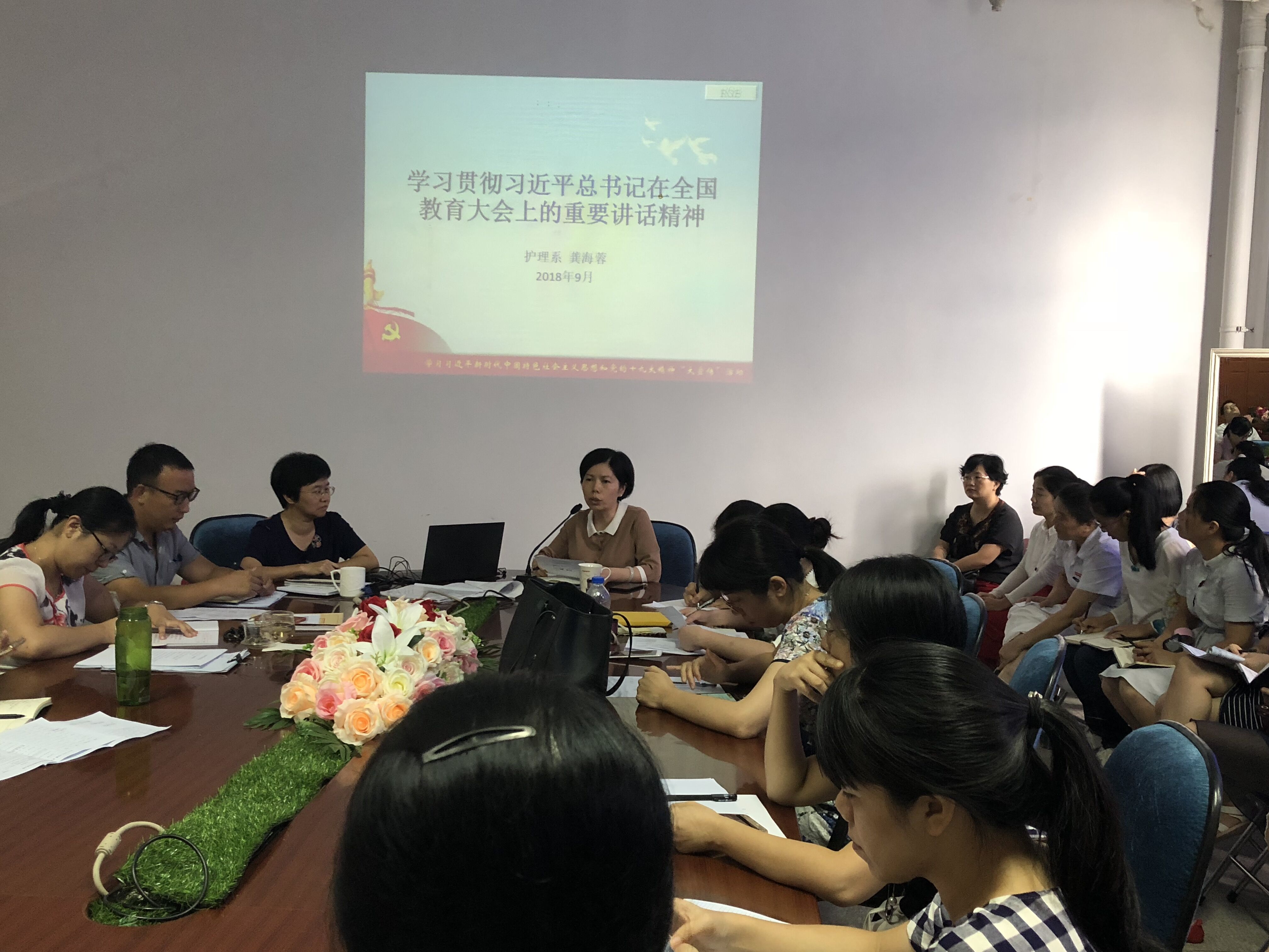 日,護(hù)理系學(xué)習(xí)習(xí)近平總書記在全國教育大會(huì)上的重要講話精神會(huì)議在護(hù)理系三樓會(huì)議室召開,會(huì)議由護(hù)理系龔海蓉主任主講,我系全體教職工參加。
